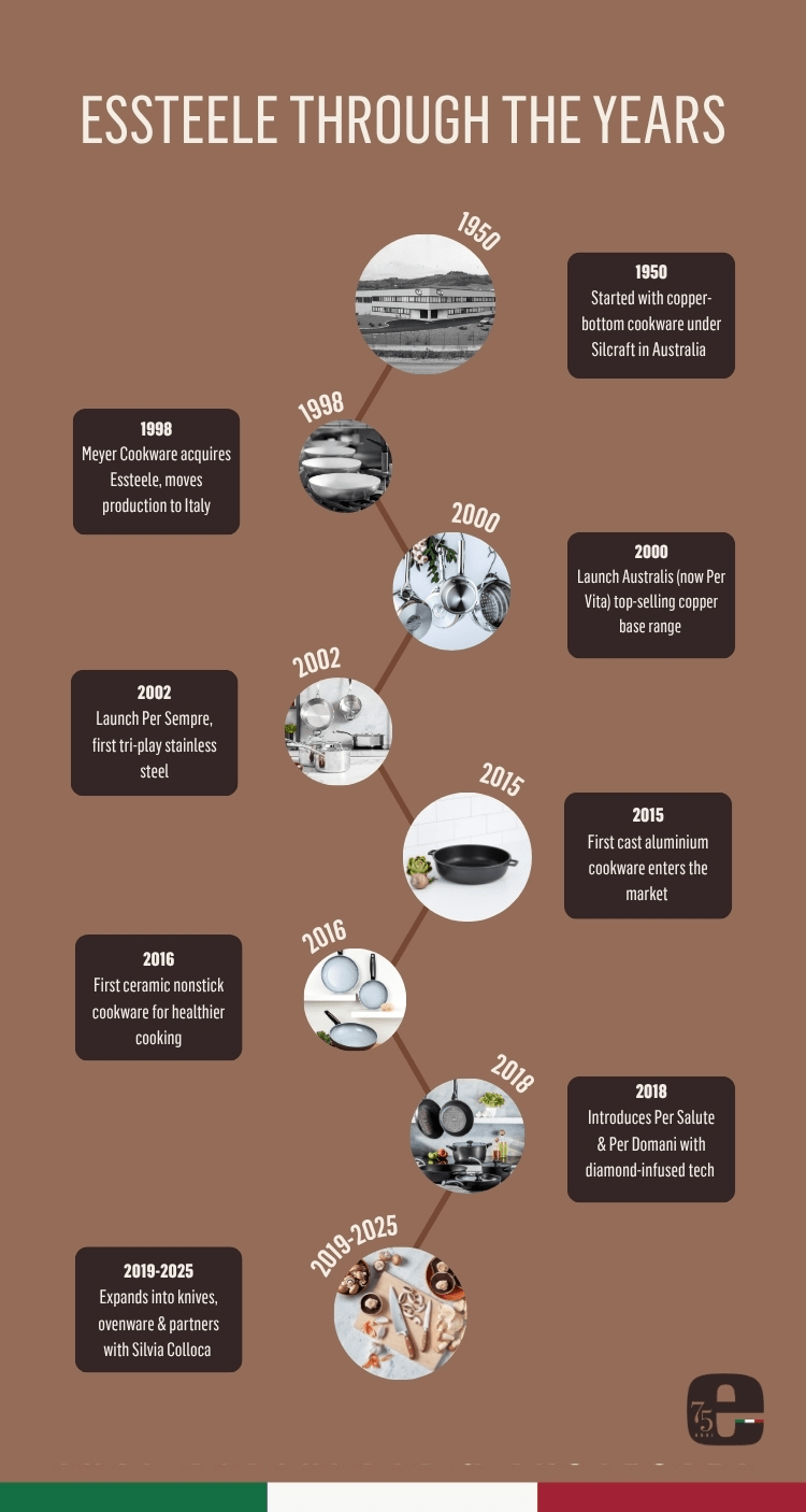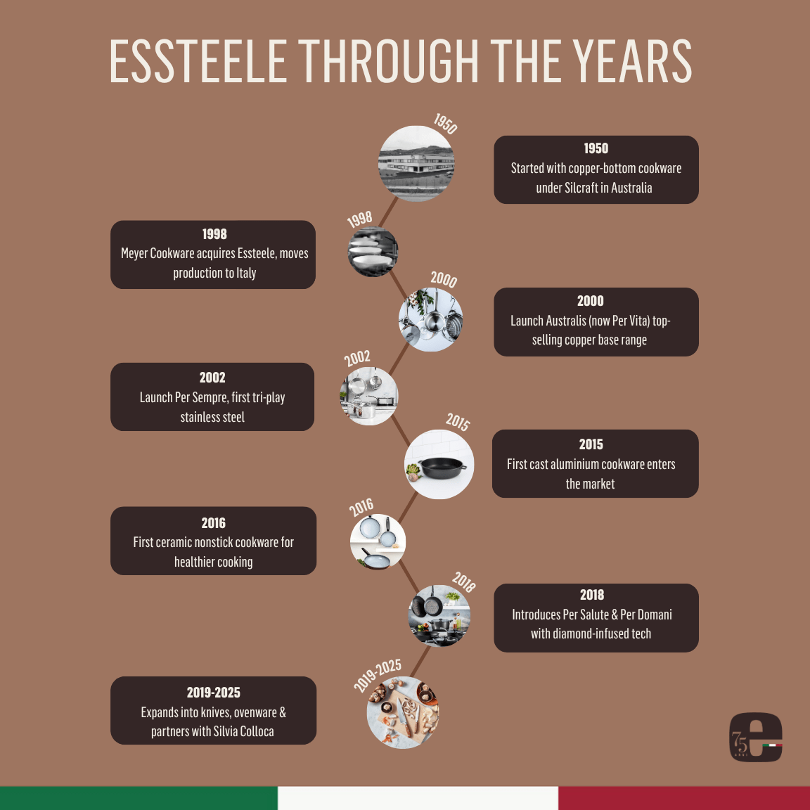 A transformative chapter began in 1998, when Meyer Cookware Australia acquired Essteele and shifted production to Italy. This strategic move combined Australian engineering standards with the refined design sensibilities of Italian manufacturing. The result was a unique fusion - Essteele cookware retained its technical excellence while gaining the beauty, sophistication, and artisanal quality synonymous with Italian craftsmanship.