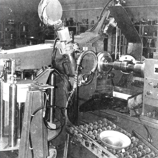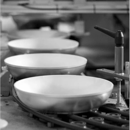 Raw pans move through the production line, where automated machinery shapes and finishes them with the craftsmanship that defines Essteele.