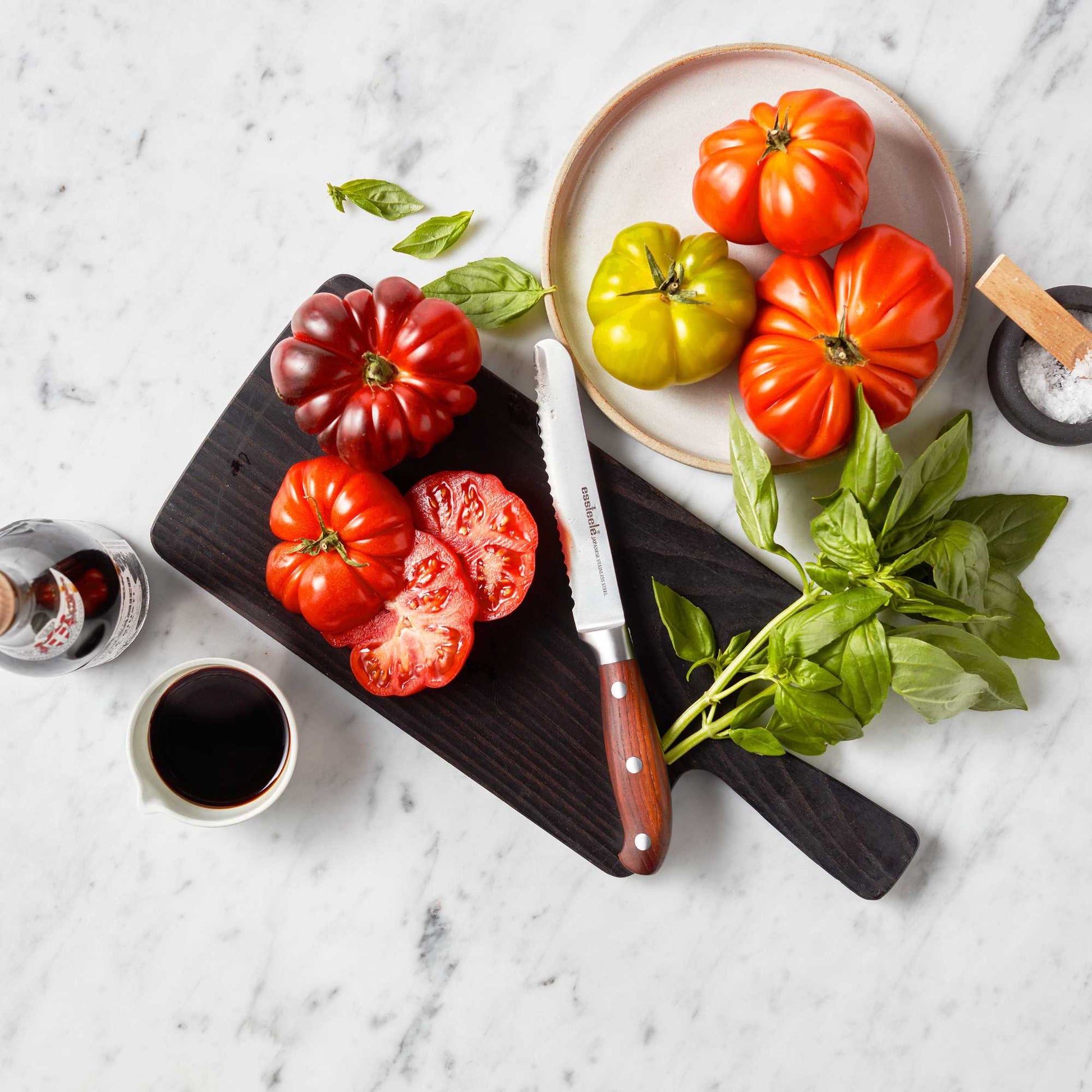 Ideally sized, the utility knife is perfect for a variety of kitchen tasks. Whether you're slicing fruits, dicing vegetables, or trimming meat, this knife ensures precision and ease. The triple-riveted carbonised ash wood handle provides a comfortable and secure grip, enhancing control during use.