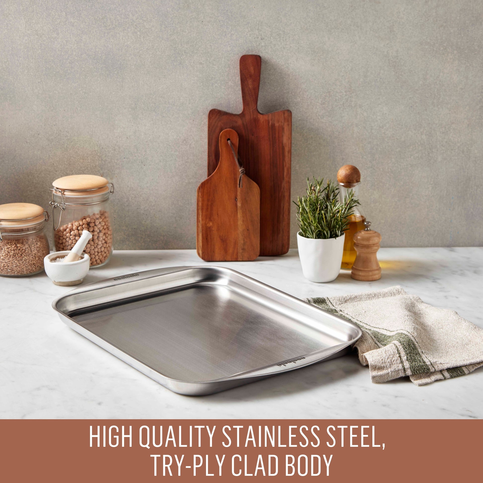 Elevate your baking experience with the Essteele Clad Stainless Steel Baking Sheet, combining exceptional craftsmanship and luxurious design to last a lifetime.